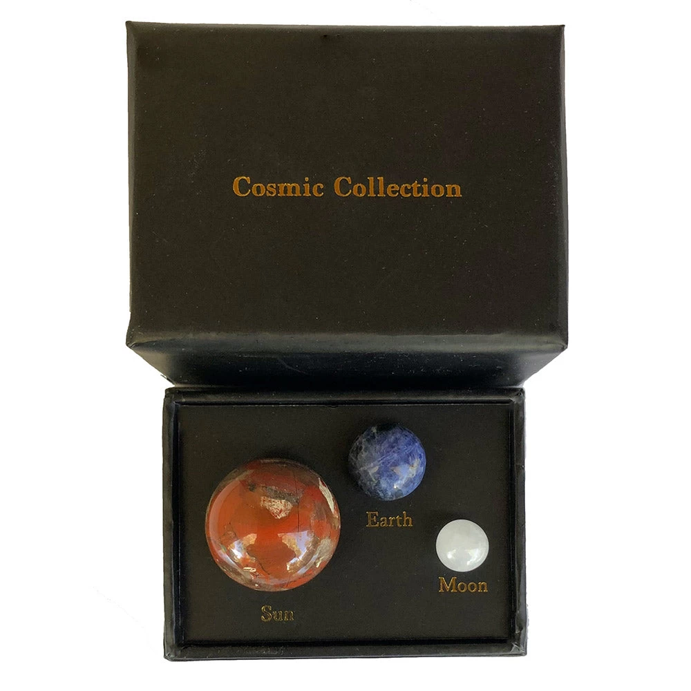 The Sun is largest made from fiery Poppy Jasper gem, while the mid-sized Earth is made of a watery blue Sodalite. Finally there’s the smallest cloudy Rock Crystal. This sweet set is perfect for a unique desk piece.