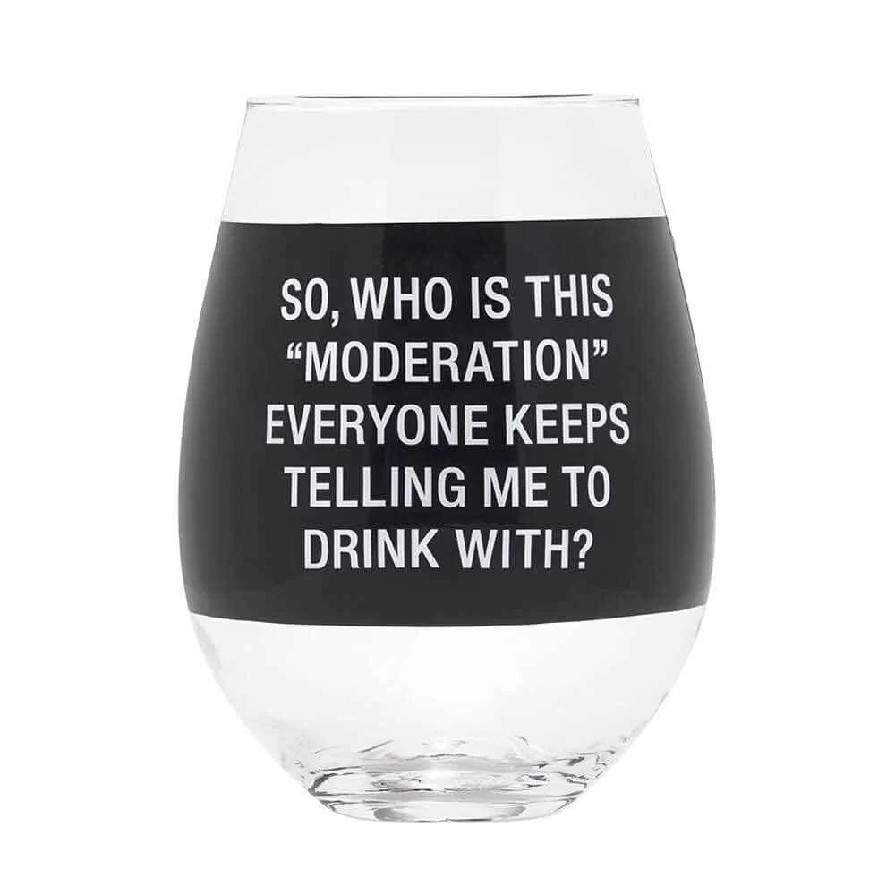 This cheeky stemless glass is perfect for a serious wine lover! It’s having a cheeky dig with “So, who is this “moderation” everyone keeps telling me to drink with?” printed on the front. Which is made all the funnier when you realise the glass holds a whopping great 887ml! That’s more than a whole standard bottle of wine!