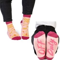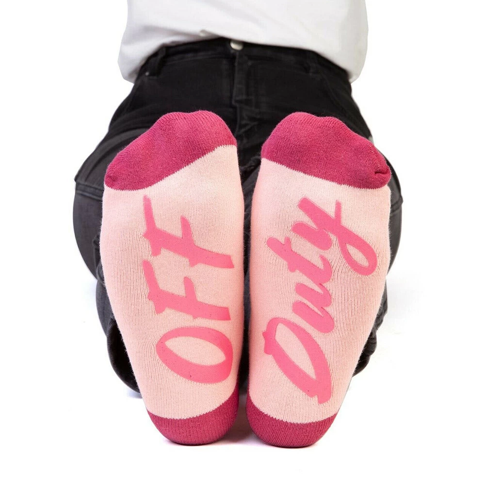 Which is why we have for you today foot coverings worthy of your Queen. Introducing our Glittery Queen Mum Off Duty Non-Slip Socks! They’re a bright pink colour with gold glitter embellishments because boring socks are for boring people and your Mum is definitely not one of those! They have “Off” and “Duty” printed on the soles in non-slip rubber, so they’re great for wearing around the house, and they have “Queen Mum” printed on the top in glittery gold.