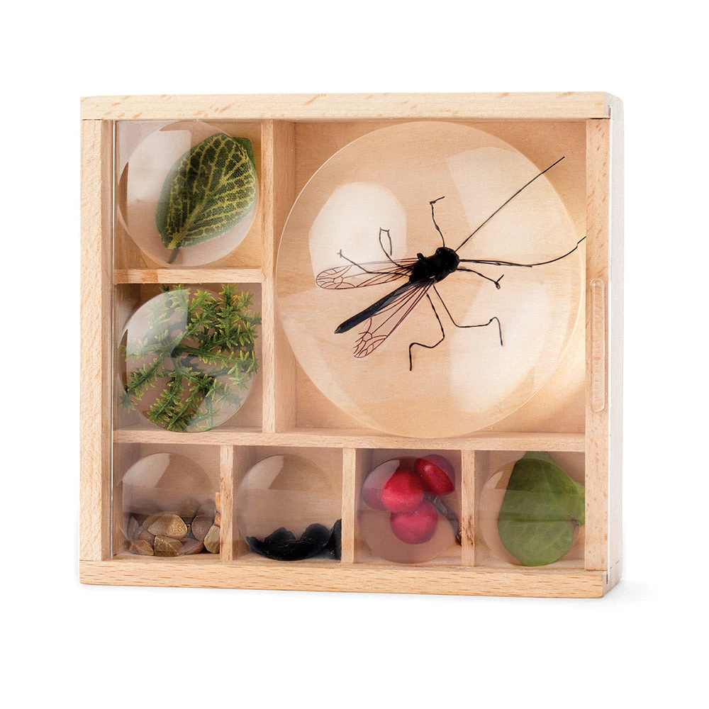 It has different sizes and magnifications for different finds – your bugs, flowers, leaves, shells and more will look great! The acrylic lid with built-in magnifiers simply slots over the top so you can change out the display as you please.