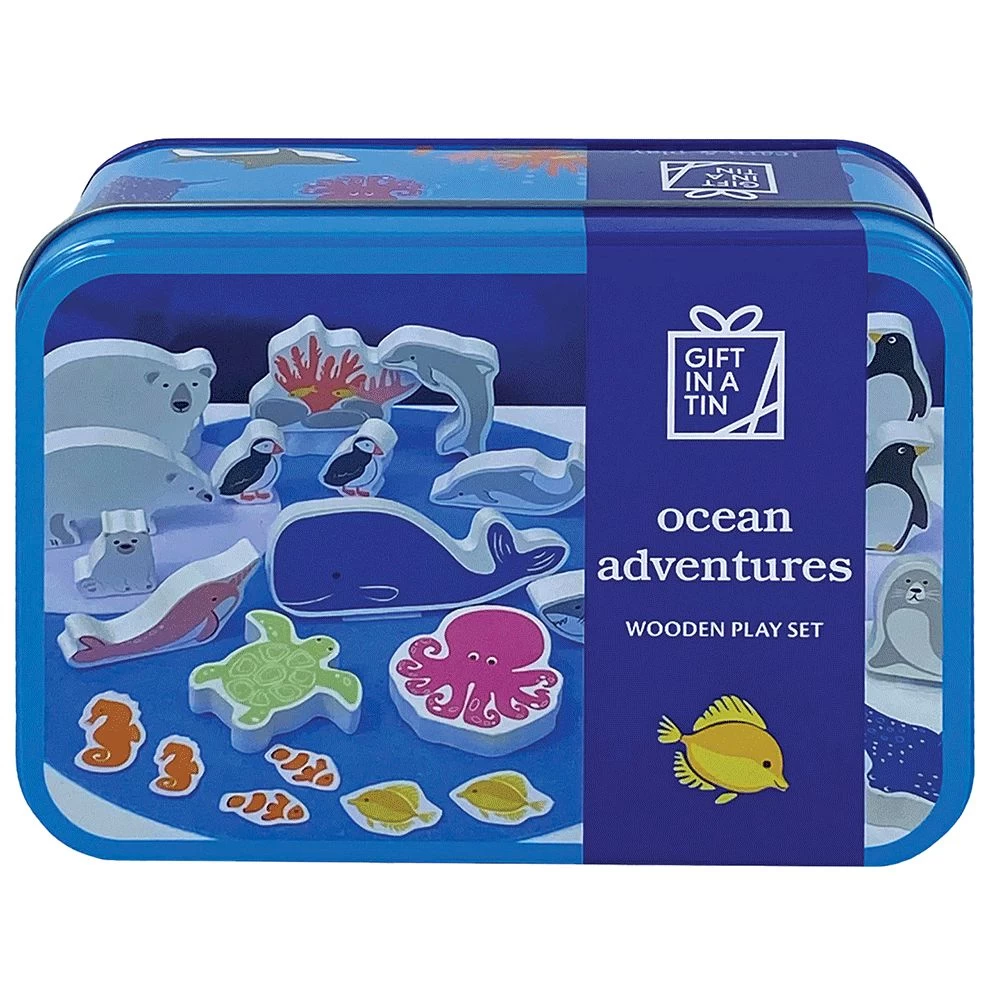 - Contents: Wooden pieces (may vary, including blue whale, narwhal, polar bear, penguin, seal, turtle, octopus, dolphin, puffin, shark, stingray, coral), 3 x play mats, paper fish & seahorses, play tips
